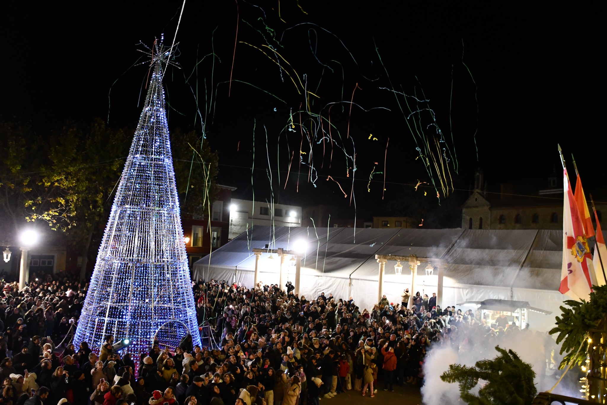 Un espectacular árbol de Navidad de 14 metros luce en la plaza del Ayuntamiento, y como novedad por primera vez cuentan con iluminación especial calles del casco histórico como General Castell y Duque de Riánsares.