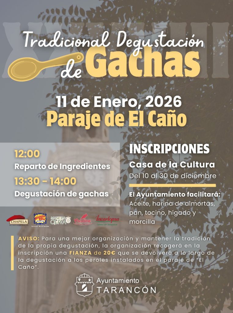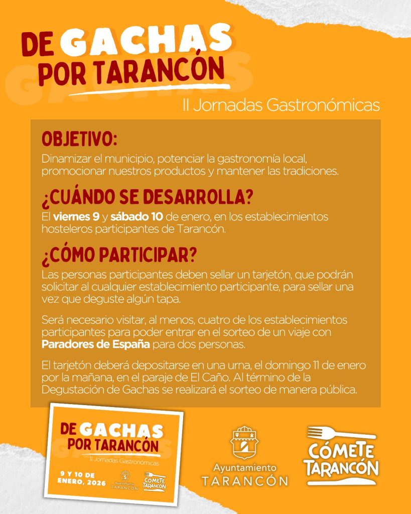 Tarancón, 9 de diciembre de 2025. Dentro de la marca de promoción del turismo gastronómico Cómete Tarancón, hoy se han presentado las II Jornadas Gastronómicas ‘De Gachas por Tarancón’, que tendrán lugar los días 9 y 10 de enero. El 11 de enero tendrá lugar la tradicional Degustación de Gachas Típicas en el paraje de El Caño, que este 2025 cumplirá su 38 edición.