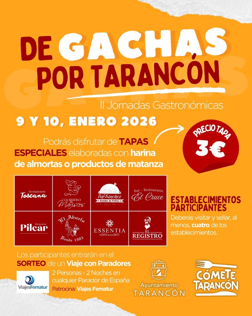 Durante ‘De Gachas por Tarancón’ las personas que lo deseen podrán degustar tapas, a tres euros, basadas en las gachas, en su ingrediente principal, la harina de almortas, o relacionados con los productos de matanza, en un total de ocho establecimientos de la localidad (El Cruce, El Registro, El Abuelo, Essentia, Toscana, Bar Sánchez, Cocedero de Mariscos y Pilcar). Asimismo, gracias al patrocinio de Viajes Fematur todos los participantes que degusten estas tapas especiales en al menos cuatro de los establecimientos podrán entrar en el sorteo de un viaje a un parador para dos personas, en régimen de alojamiento y desayuno.